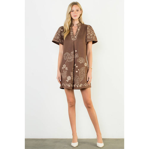 Brown Short Sleeve Embroidered Detail Dress