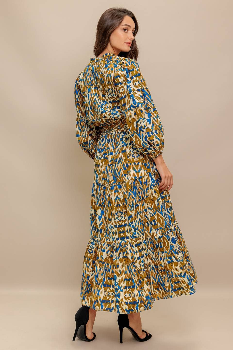 A printed woven midi dress featuring V neckline, 3/4 sleeve, elasticized waist with self sash and tiered skirt
