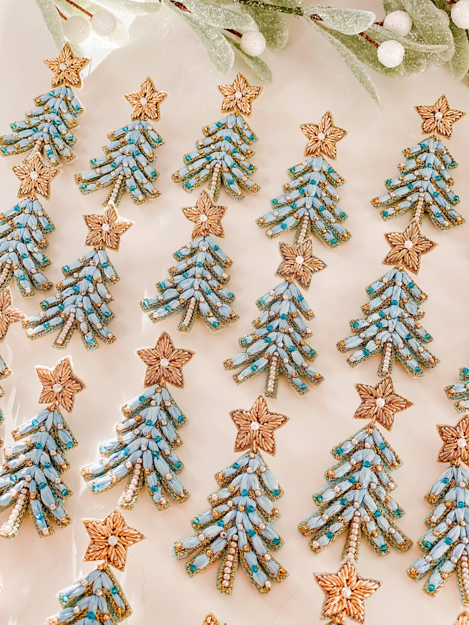 Celebrate the season with our Christmas Raffia Tree Earrings, where playful materials meet harmony and elevated design. Handcrafted by skilled artisans, these unique earrings feature delicate and timeless blue raffia that exudes relaxed vibes, seamlessly blended with shimmery materials to create a perfect balance of sparkle and fun. Adorned with small dainty beads, pearls and shimmering badka material, they embody the essence of holiday cheer while maintaining a refined look.