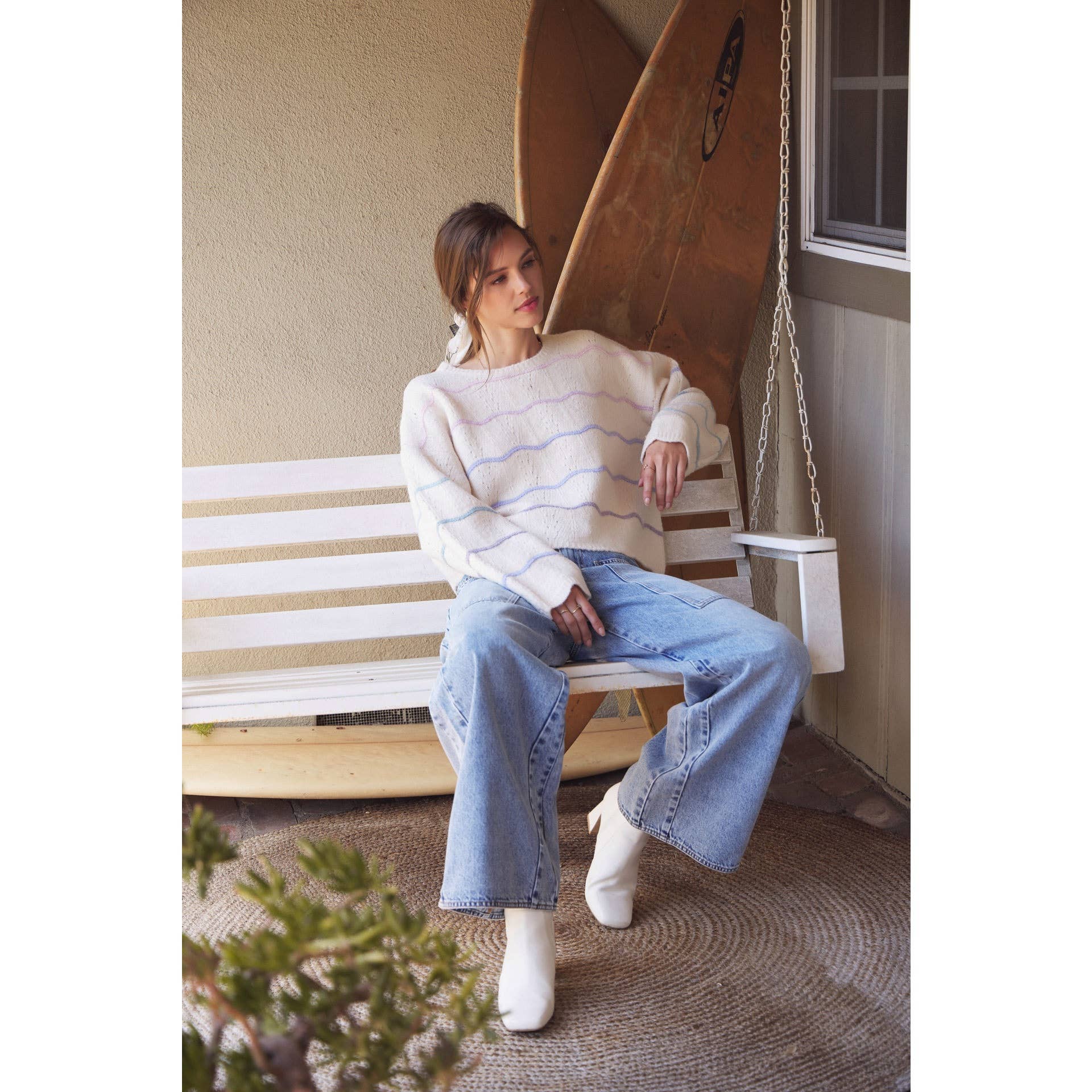 Soft, sweet, and surprisingly refined — this cozy oversized sweater blends thoughtful craftsmanship with everyday ease. Featuring pastel ombré scallop stripes hand-placed with care, it’s a piece that turns simplicity into something special. The round neckline and relaxed silhouette make it perfect for layering on chilly mornings, whether you're heading out for coffee or cozying up at home. And it’s not just a pretty knit — the wool blend includes 50% recycled polyester, offering an eco-conscious twist to your fall lineup. A quiet luxury piece with a gentle pop of color, this is the kind of sweater that brings calm confidence and warmth to any moment. Style it with jeans or wide-leg trousers for an effortlessly cool look. Features - Oversized fit - Sweater top - Contrast ombre scallop details - Long-sleeves - Round neck Size + Fit Model is 5'9.5" and wearing a size Small Please refer to our size chart.