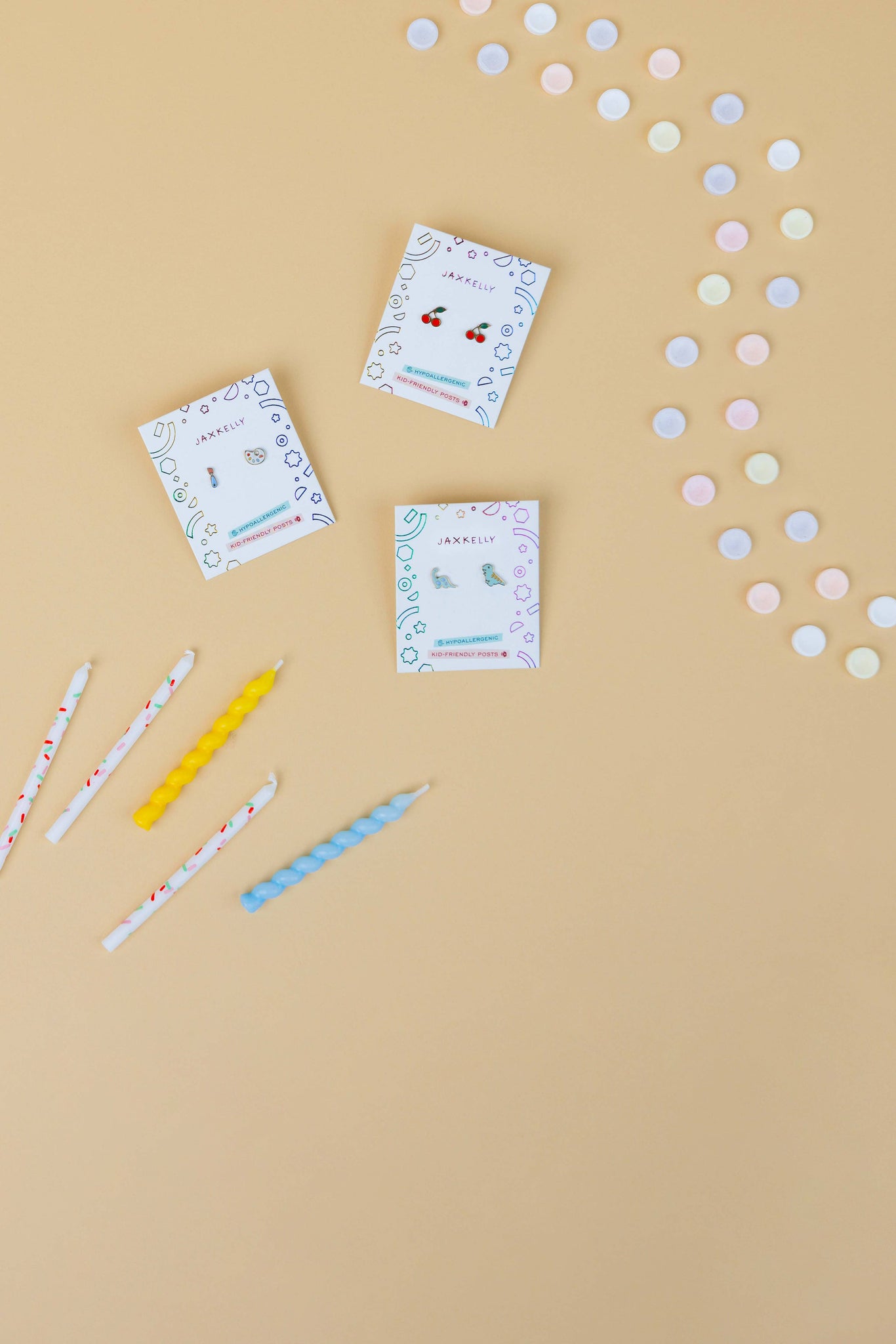 High-quality, hypoallergenic earrings are made for kids with sensitive ears and can be worn 24/7. Designed for kids but cute enough for grown-ups too! -Post Length: 10mm -Post Size: 20 gauge, .8mm -Flat screw back -Waterproof and can be worn in the pool and bath -Poke-free back -Surgical grade stainless steel -18K gold plated -Lead, copper & nickel free -Enamel