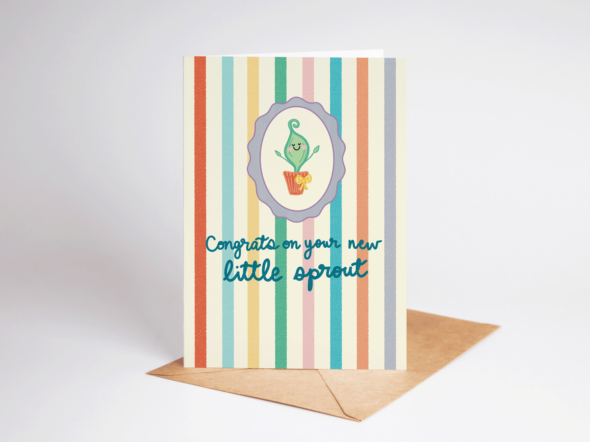 Send new parents some love with this beautiful 5x7 card, featuring a teeny green smiling sprout in a pot with the phrase "Congrats on your new little sprout". The card is blank inside for your own personal message, and comes with a brown kraft envelope. Perfect for new parents, new moms, baby events like baby showers, and more!