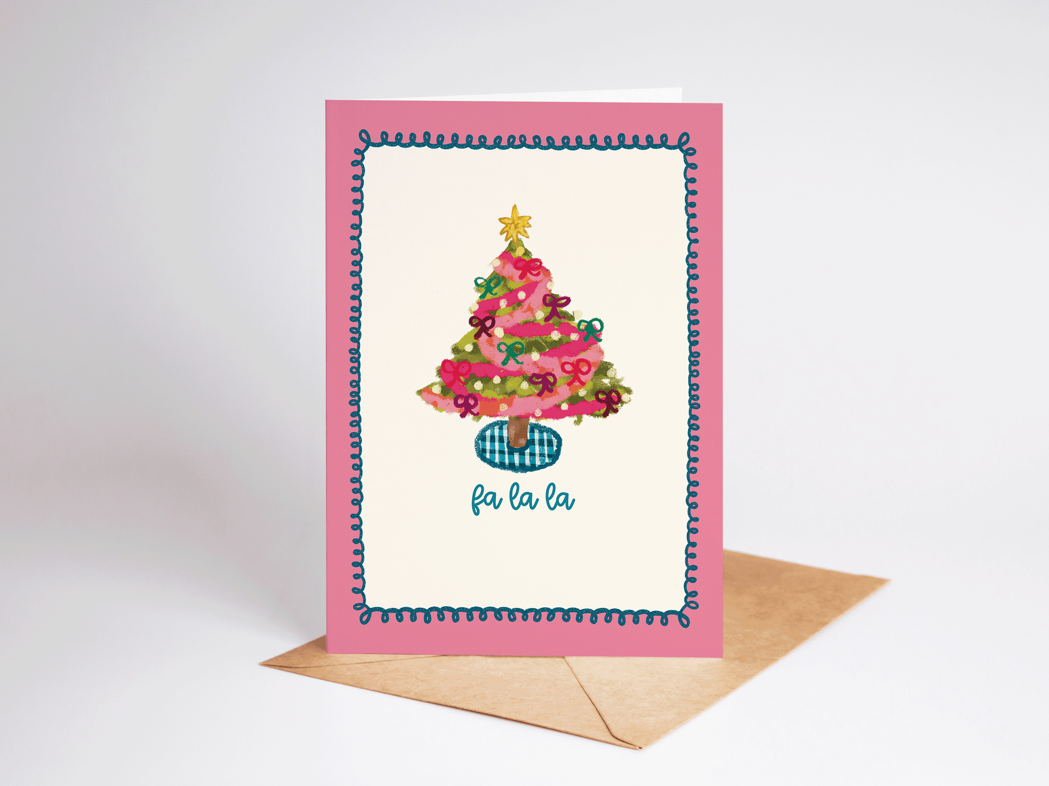 Send a winter-wonderful message with this adorable 5x7 card, featuring a colorful Christmas tree decked out with tinsel, ornaments, and a star along with the simple phrase, "fa la la". The card is blank inside for your own personal message, and comes with a brown kraft envelope. Perfect to celebrate the Winter season, thinking of you, just because, and more!