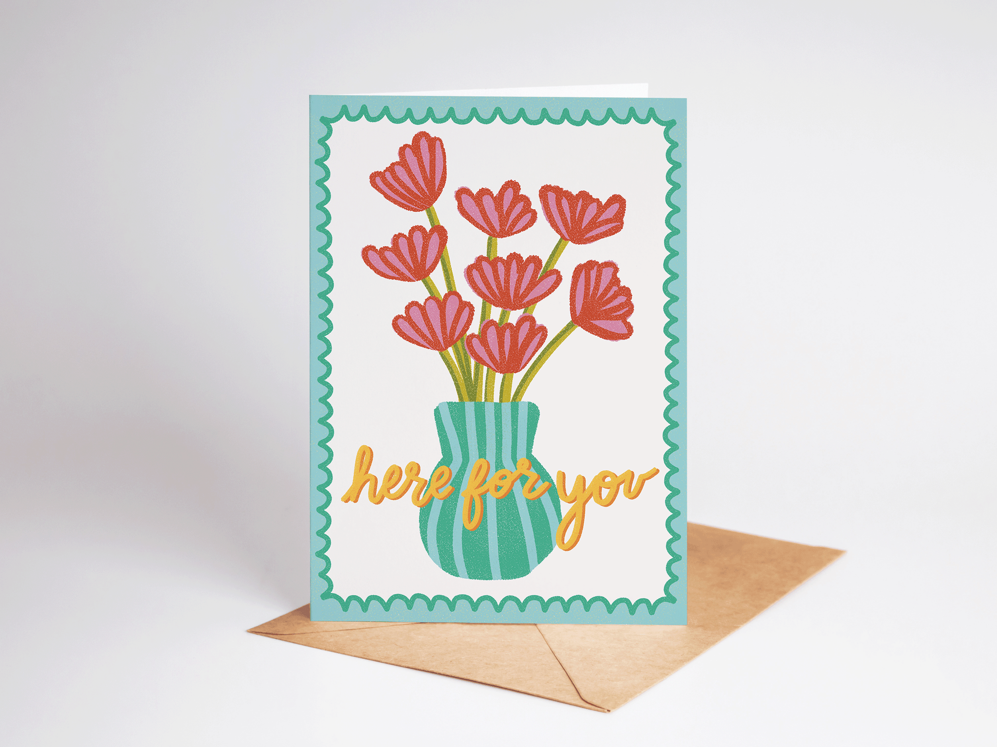 Let your loved one know you're there for them with this beautiful 5x7 card, featuring bright red flowers in a teal vase and the simple sentiment "here for you". The card is blank inside for your own personal message, and comes with a brown kraft envelope. Perfect for sympathy, thinking of you, support, and more