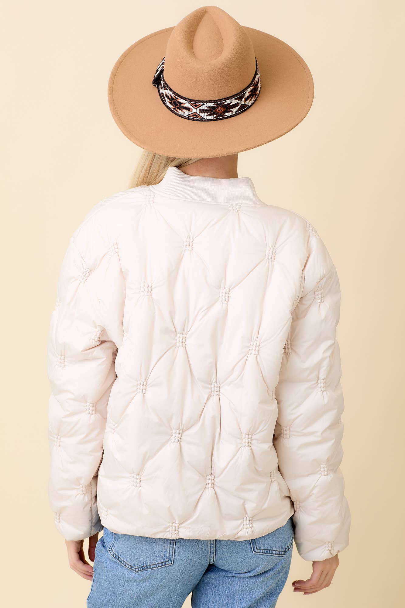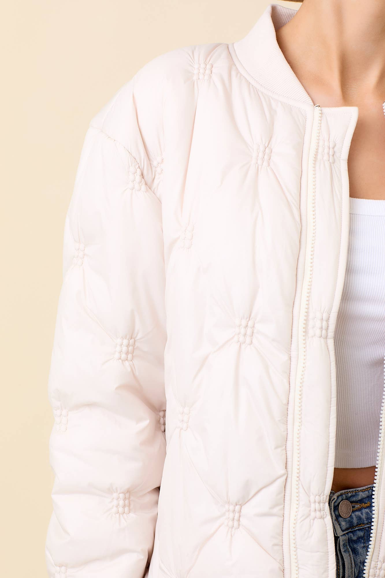 A cozy quilted bomber jacket featuring soft pastel tones and cloud-like stitching detail. The lightweight fill provides just the right warmth without bulk, while the relaxed fit makes it perfect for layering over knits or tees. Ideal for chic winter styling with a feminine twist.