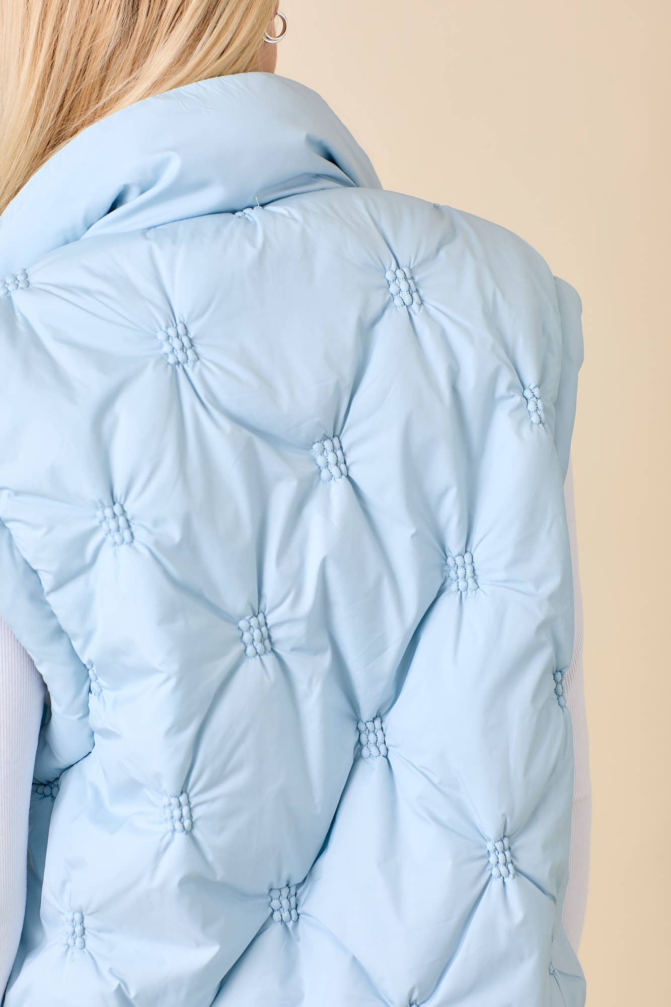 Stay cozy and chic in this quilted cloud puffer vest, designed in soft pastel hues. The plush texture and lightweight feel make it a perfect layering piece for chilly days. Style it over knits or tees for an effortlessly cute winter look. puffer vest, pastel outerwear, quilted vest, winter layering, soft padded vest, light blue vest, pink puffer, cozy outer, chic winter look