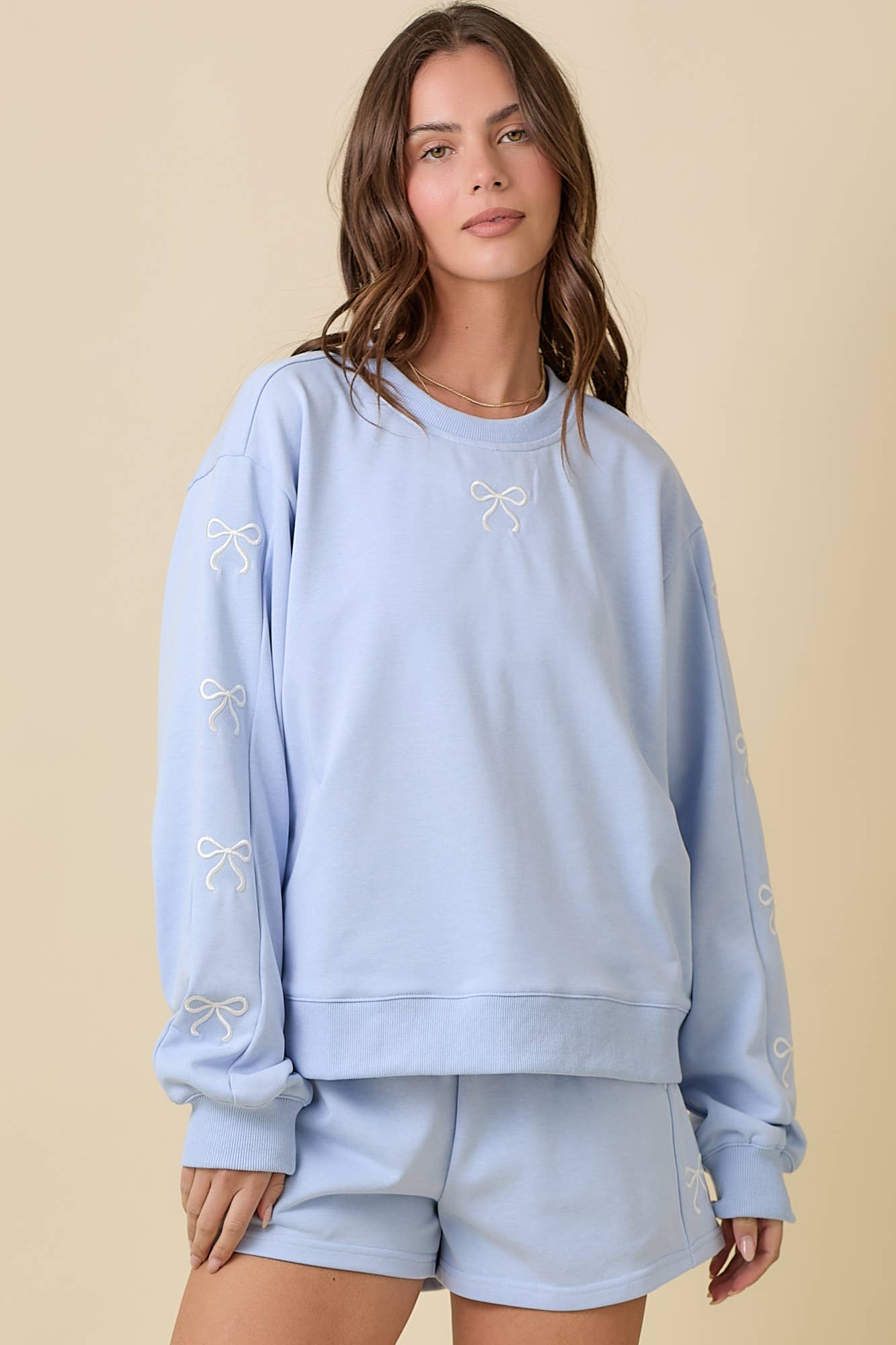 Soft and cozy sweatshirt featuring delicate ribbon embroidery along the sleeves. The relaxed fit and pastel tone create a feminine, playful lounge vibe. Perfect for pairing with matching shorts or jeans for a cute off-duty look.