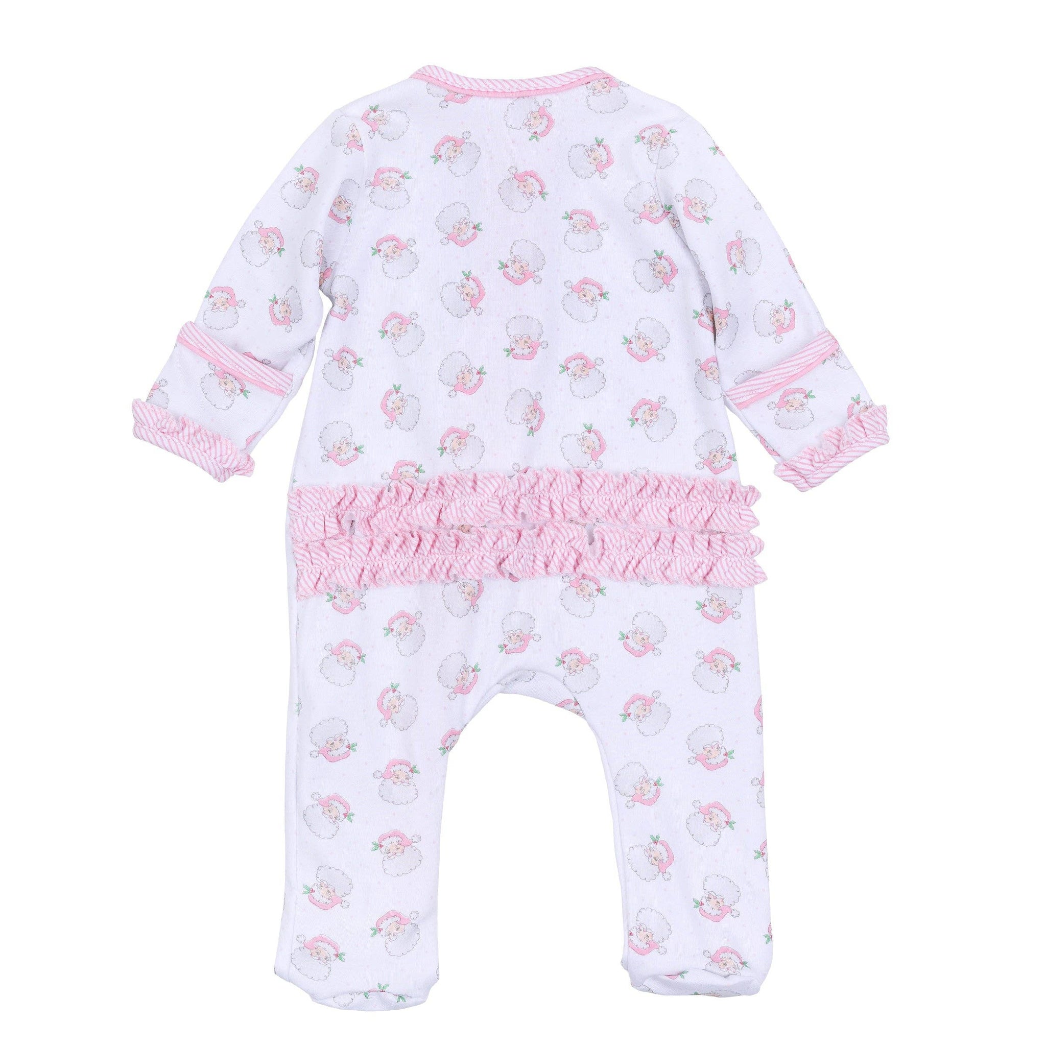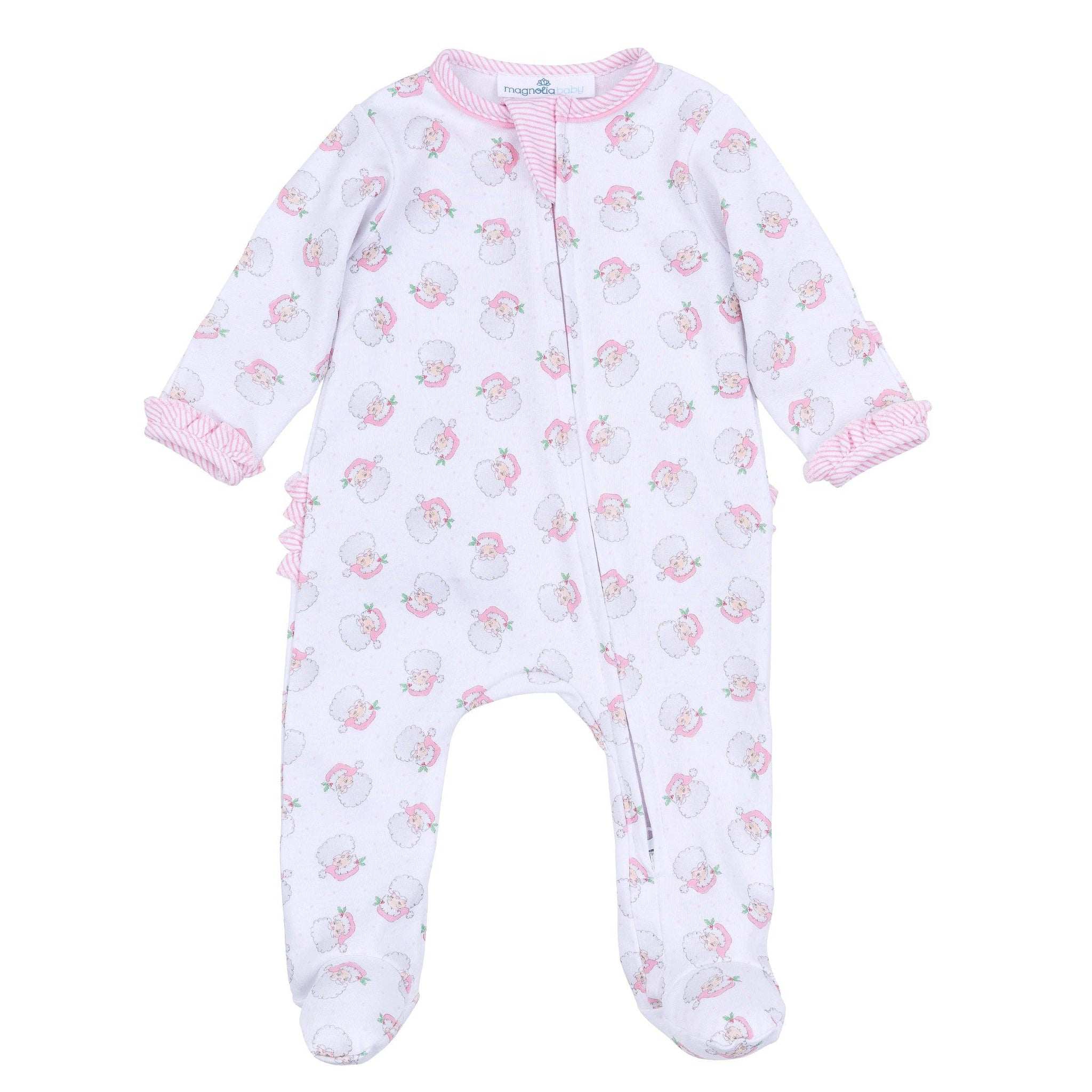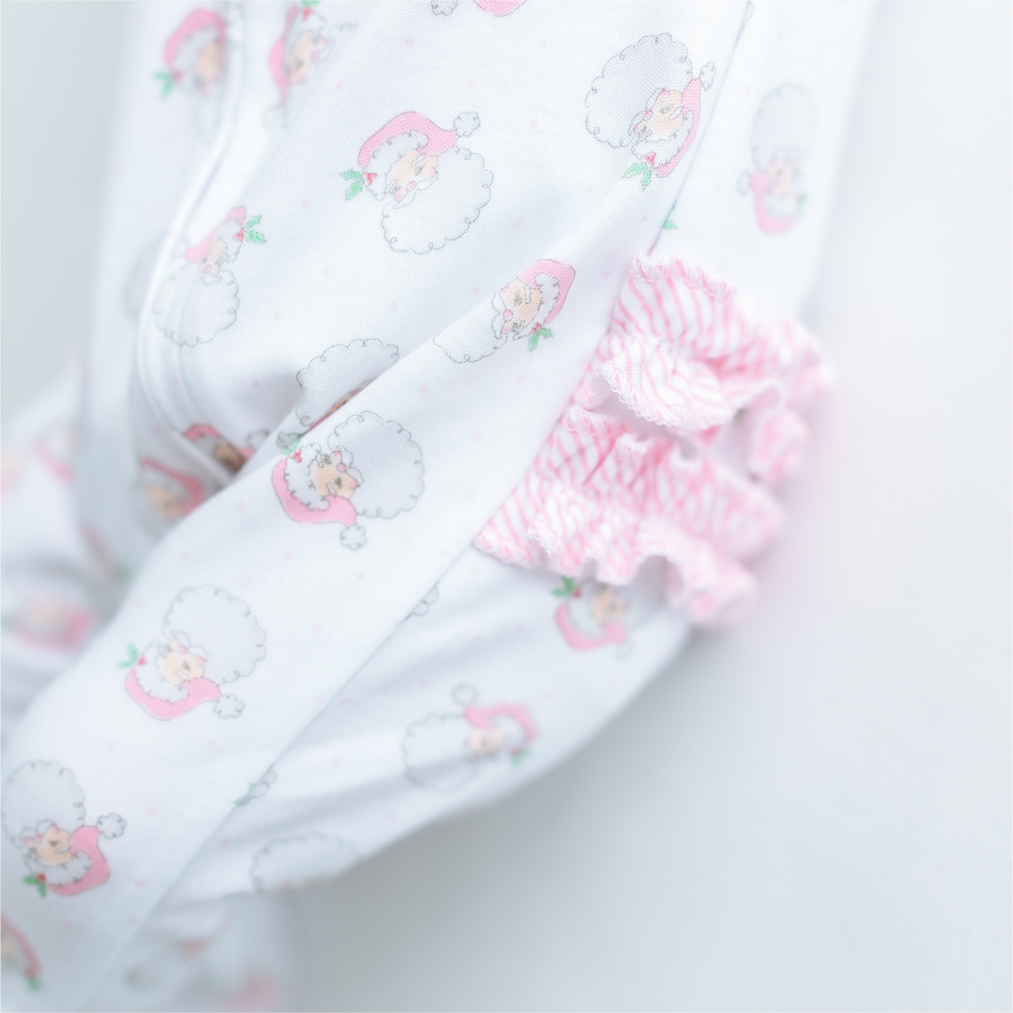 Santa Baby Print Ruffle Zip Footie - Pink Simplify holiday dressing with our Santa Baby Print Ruffle Zip Footie - Pink. Inspired by the joyful spirit of Santa Claus, this charming white footie, crafted from luxurious Pima Cotton, features an all-over Santa print and a convenient two-way zipper. Features: * 100% Pima Cotton: This luxurious and soft fabric is gentle on your baby's delicate skin.