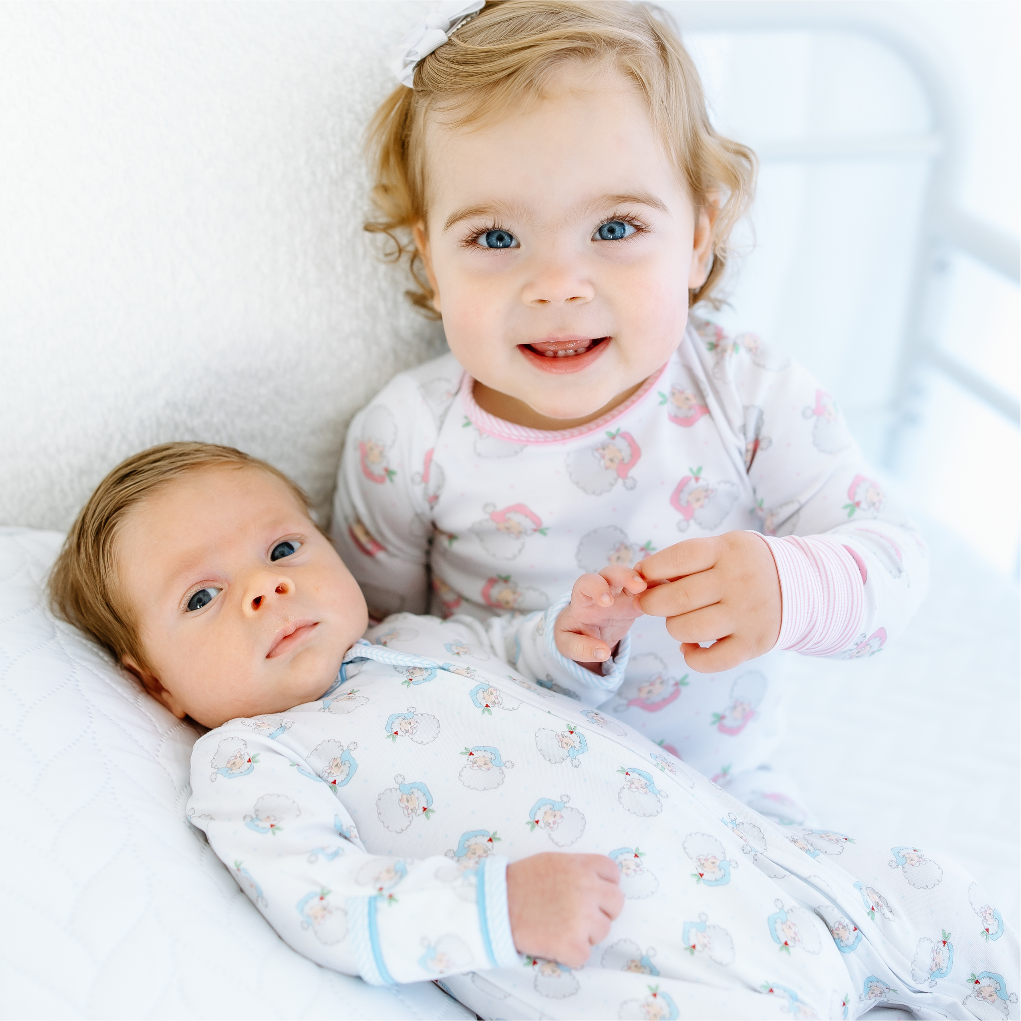 Santa Baby Print Zip Footie - Light Blue Simplify holiday dressing with our Santa Baby Print Zip Footie - Light Blue. Inspired by the joyful spirit of Santa Claus, this charming white footie, crafted from luxurious Pima Cotton, features an all-over Santa print and a convenient two-way zipper for quick changes. Features: * 100% Pima Cotton: This luxurious and soft fabric is gentle on your baby's delicate skin.