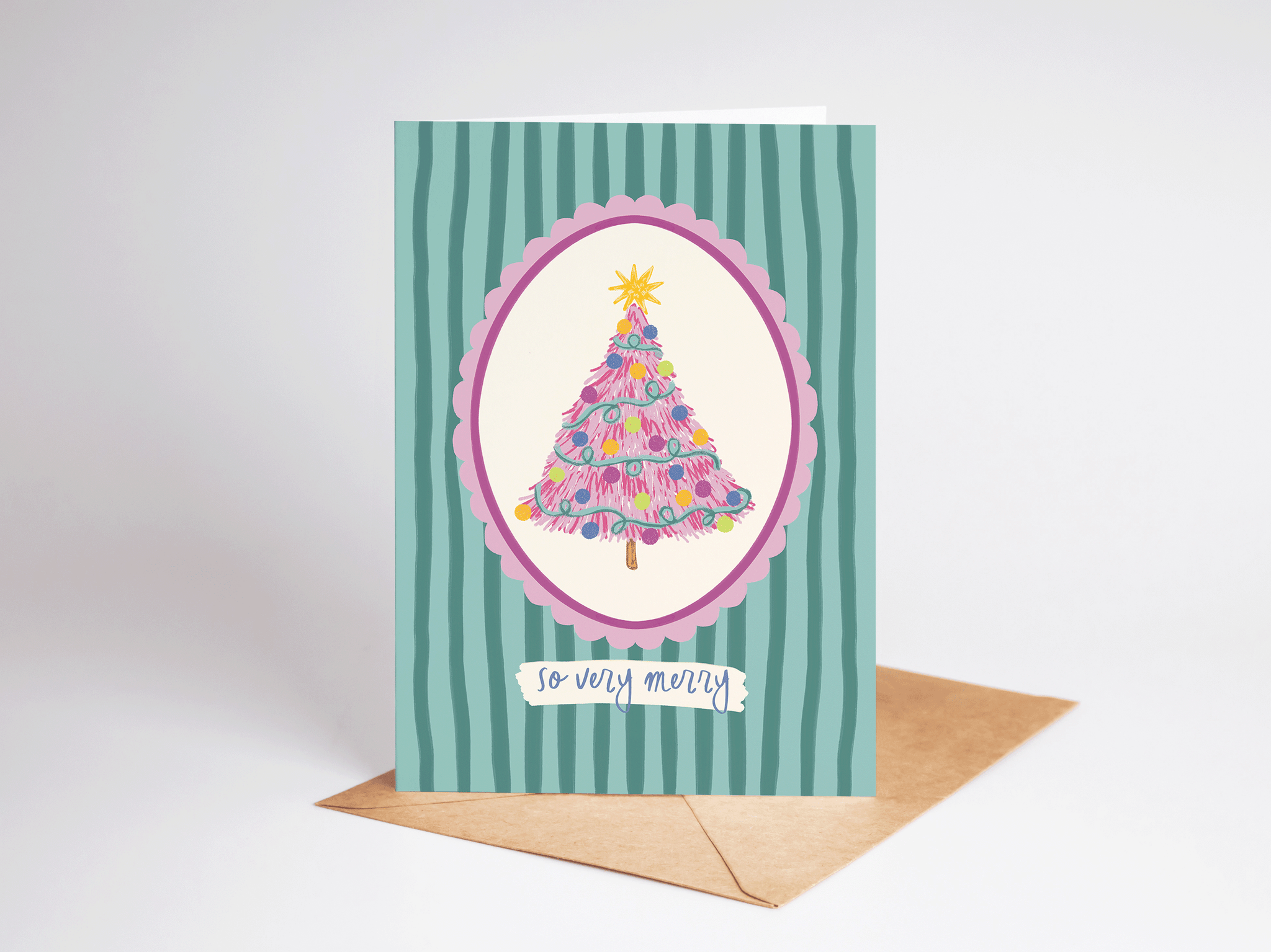 Send a winter-wonderful message with this adorable 5x7 card, featuring a bright pink tree decorated with ornaments and tinsel on a striped background along with the phrase, "so very merry". The card is blank inside for your own personal message, and comes with a brown kraft envelope. Perfect to celebrate the Winter season, Christmas wishes, Holiday gatherings, thinking of you, just because, and more!